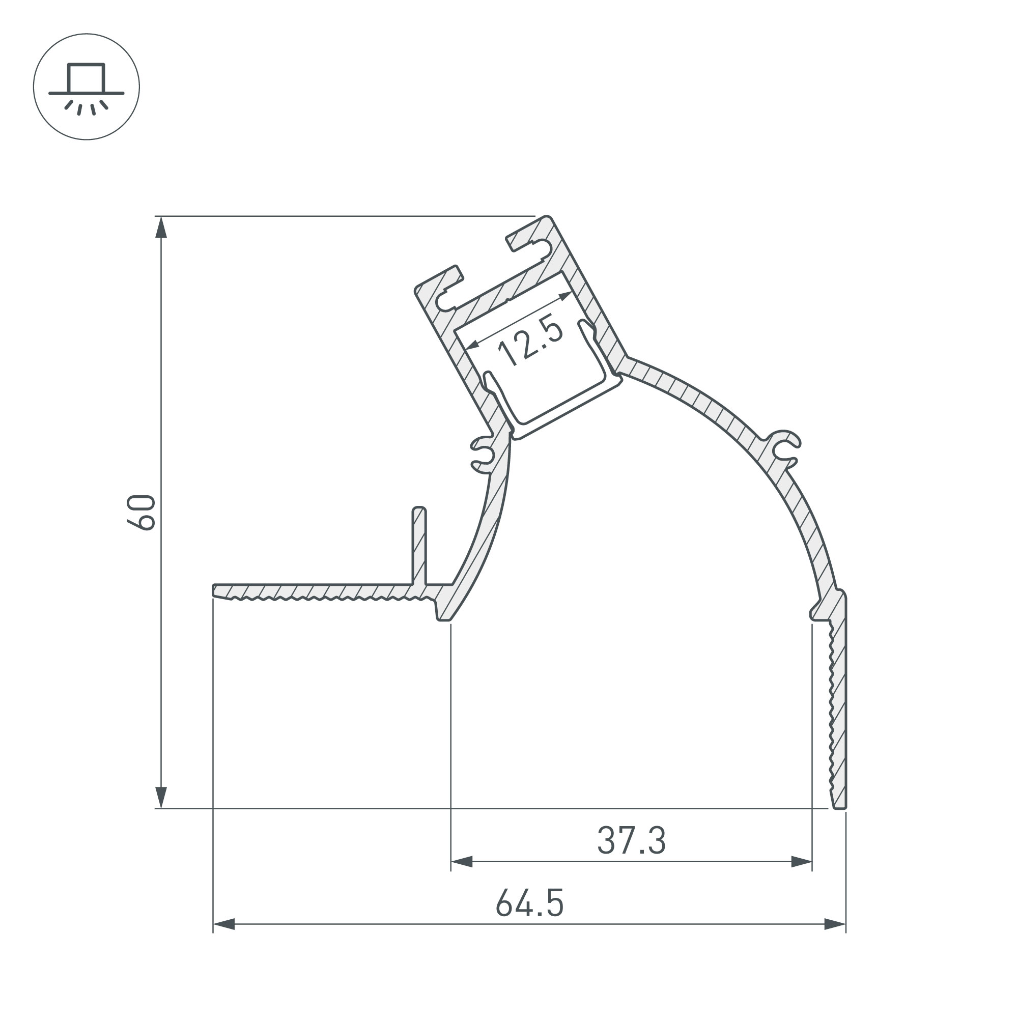 Габаритные размеры (L×W×H): 2000 x 64,5 x 60 мм. Ширина площадки для ленты 12,5 мм.