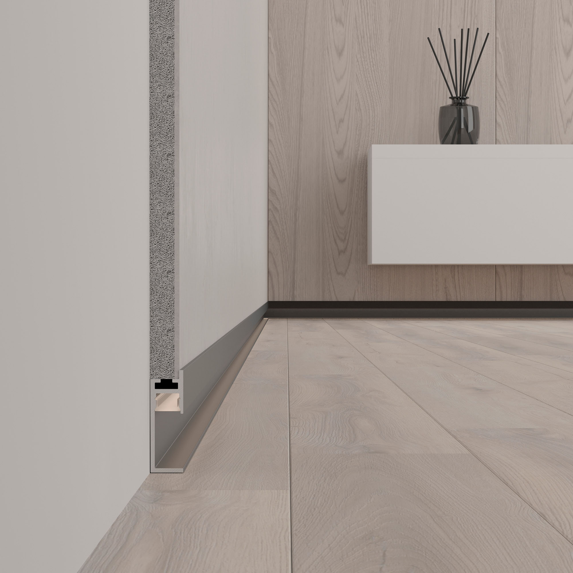 Встраиваемый алюминиевый профиль-плинтус с накладным фланцем черного цвета для создания эффекта парящей стены.